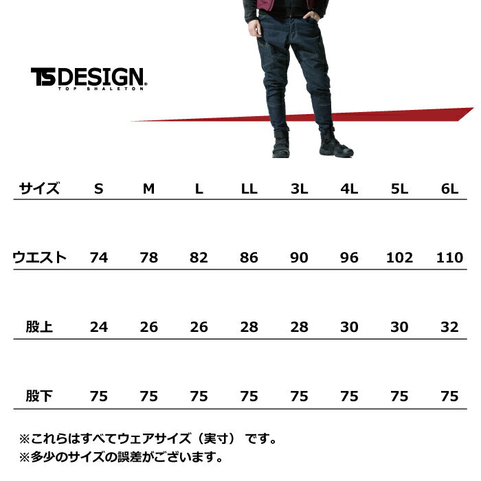 作業服 5234S〜LL3L〜4L他のサイズを選ぶ●●商品説明●関連商品※5234メンズニッカーズ中綿キルティングカーゴパンツ※5134メンズニッカーズカーゴパンツ※51345メンズニッカーズショートカーゴパンツ●秋冬用●素材:ストレッチデニム 綿75% ポリエステル23% ポリウレタン2%●ウエストストレッチ、ストレッチ、製品洗い、保温性、クイックアクセスポケット、コインポケット、オリジナルドットボタン、裾リブ、両脇ダブルループ、コインポケット刺繍、クイックアクセスポケット、TS DESIGNオリジナルスライダー、TS DESIGNロゴ刺繍入り●サイズ:S(ウエスト/74、股上/24、股下/75)、M(ウエスト/78、股上/26、股下/75)、L(ウエスト/82、股上/26、股下/75)、LL(ウエスト/86、股上/28、股下/75)、3L(ウエスト/90、股上/28、股下/75)、4L(ウエスト/96、股上/30、股下/75)、5L(ウエスト/102、股上/30、股下/75)、6L(ウエスト/110、股上/32、股下/75)●カラー:ネイビー、ブラック商品仕様ストレッチ性に優れるポリウレタン糸使いの生地使用。