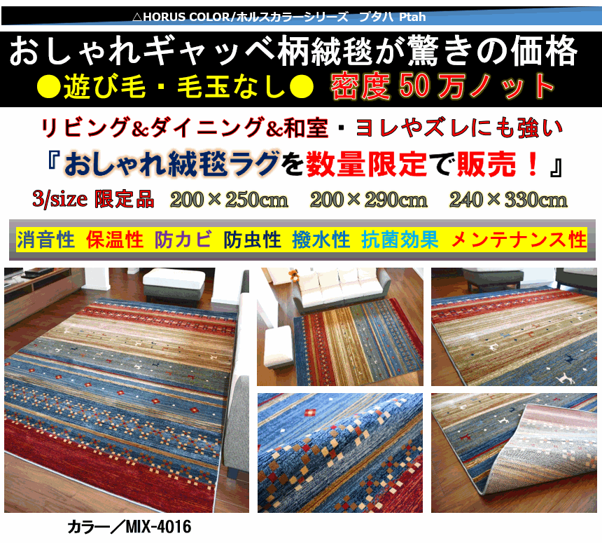 HORUS COLOR ギャッベ柄ラグ【プタハ/Ptah-4016】 約3畳 200×250cm 特徴 エジプト製 ウィルトン織 毛 足:9mm 全厚:12mm ノット数:500,000ノット 素 材:ポリプロピレン100% 糸質抜群 ヒートセット加工 ホットカーペット/床暖対応 耐久性 保温性 良糸質 サイズ価格表 約3畳(200x250cm)・・・・・29,800円 約4畳(200x290cm)・・・・・34,800円 約6畳(240x330cm)・・・・・47,800円 おしゃれでかわいいギャベ柄 ラグ 絨毯を圧倒的な安さで販売!厚手でしっかりとした作り 糸質も抜群! ●ウィルトン織だからヨレやズレにとても強く お掃除もラクラク (3色 200×250cm 200×290cm 240×330cm展開) ●遊び毛 毛玉なくが全くなく50万ノットだから耐久性抜群でメンテナンス性抜群! ≪安心価格のHORUS COLOR ホルスカラー/ブランド製品です≫ (撮影場所:ハウスメーカー(株)クワザワさん モデルルーム内から撮影) ↑↑カラー:MIX-4016 ●防音性 防汚性 耐久性 メンテナンス性UP どこにも負けない圧倒的な安さで販売中!