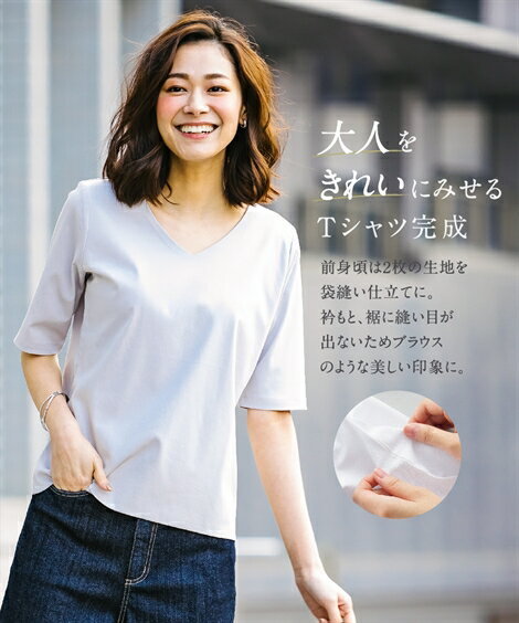 Tシャツ カットソー レディース 大人の品格 ダブルフロント 深Vネック 5分袖 トップス モカ/ライトグレー/ラベンダー/黒/白 S/M/L/LL ニッセン