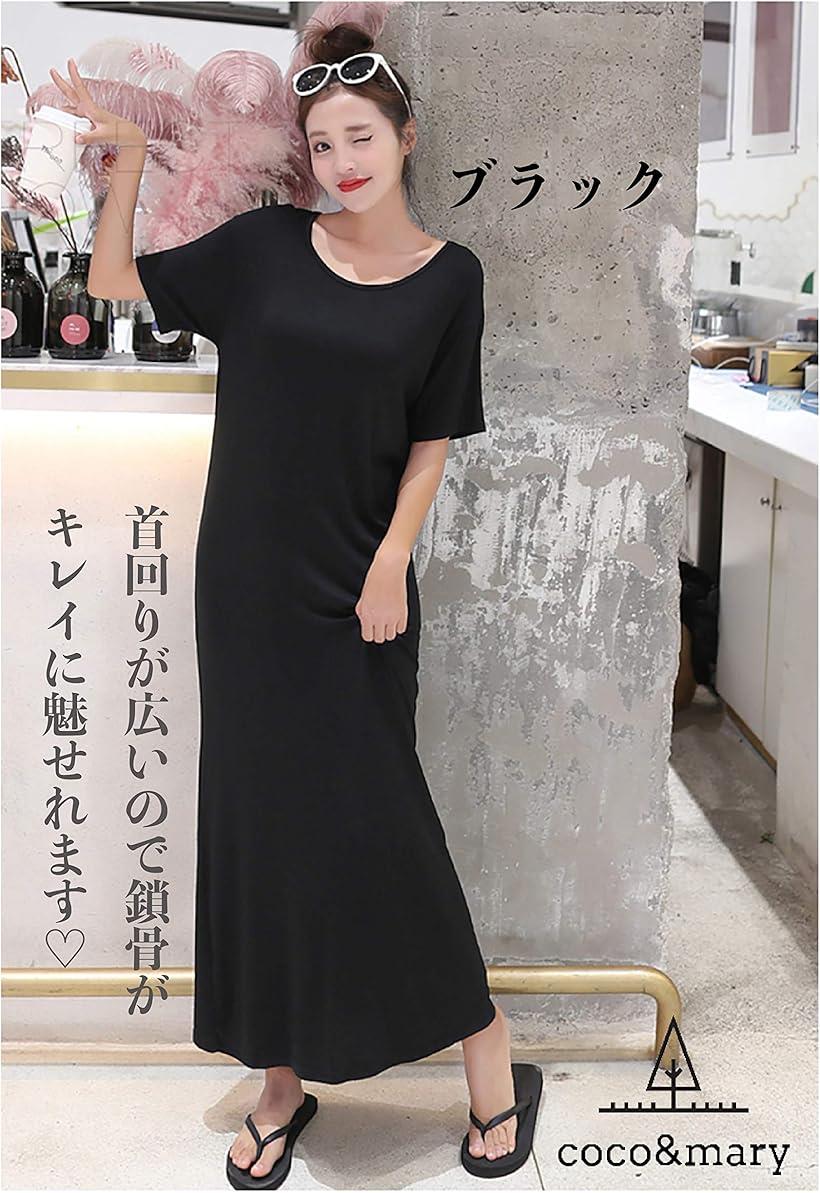 リラックス 薄手 Tシャツ ワンピ マキシ 丈 半袖 ロング ワンピース 無地 ルームウェア レディース ロンT ゆったり トップス 5分袖 五分袖 はんそで 半そで ロングTシャツ おしゃれ かわいい パジャマ 春(ブラック, XLサイズ)